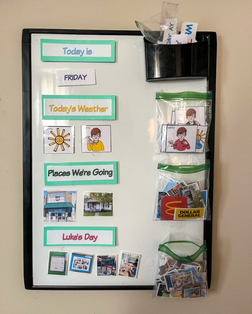 Using visual supports not only makes communication accessible, it also reduces anxiety, creates predictability and supports independence. In our living room is Luke’s visual schedule. I made it using a dry erase board, laminated words and pictures and Velcro dots. It’s a great communication tool. Each day, he checks out his board to see what his day will look like.