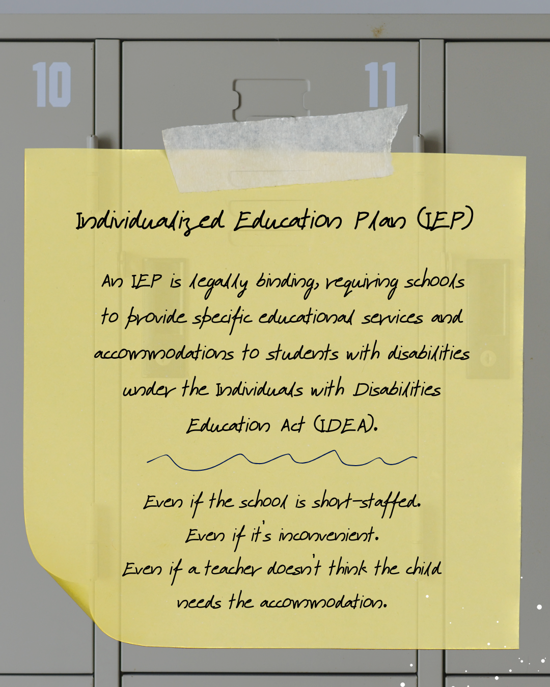 An Individualized Education Plan (IEP) is a legally binding document that serves as a contract between the parents and the school, mandating that the school provide the services and accommodations that are outlined and agreed upon in the document. It’s not a suggestion. It’s not optional. It’s federal law.