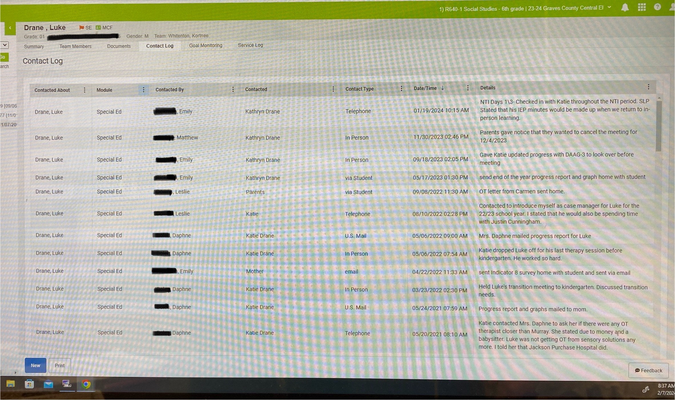 In special education, the parent contact log is used for tracking interactions, ensuring transparency, and maintaining records of discussions about a student’s IEP. Here’s Luke’s preschool parent contact log for reference. I figured that even if Cunningham hadn’t completed a seclusion report, he would have documented that he notified me verbally about the incident. This log can only be accessed from the school side of Infinite Campus, not the parent portal.