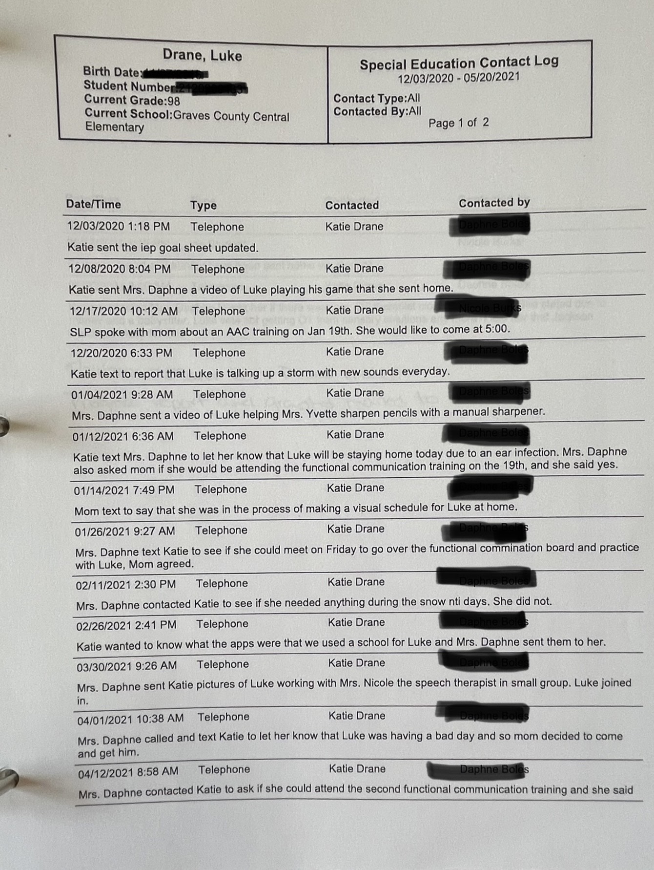 I was shocked. There was hardly any documentation from the past two years. Significant conversations about serious events weren’t there, like it never even happened. I found Principal Cornwell in the hall and said “I don’t need your help anymore. I saw the parent contact log and Justin [Cunningham] didn’t document the safe room. He didn’t even document the Becky incident,” (the abuse incident). She said “ok” and we went our separate ways.