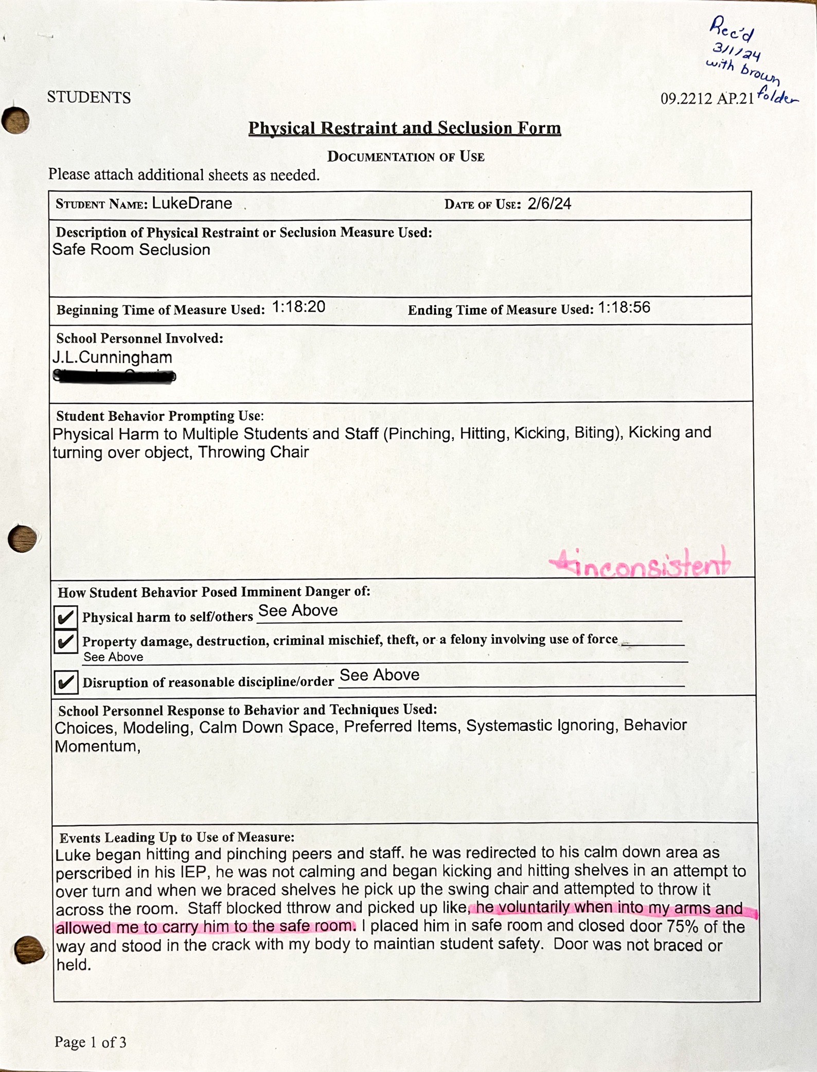 - Cunningham wrote “he voluntarily went into my arms and allowed me to carry him to the safe room”, which proved improper use of seclusion.