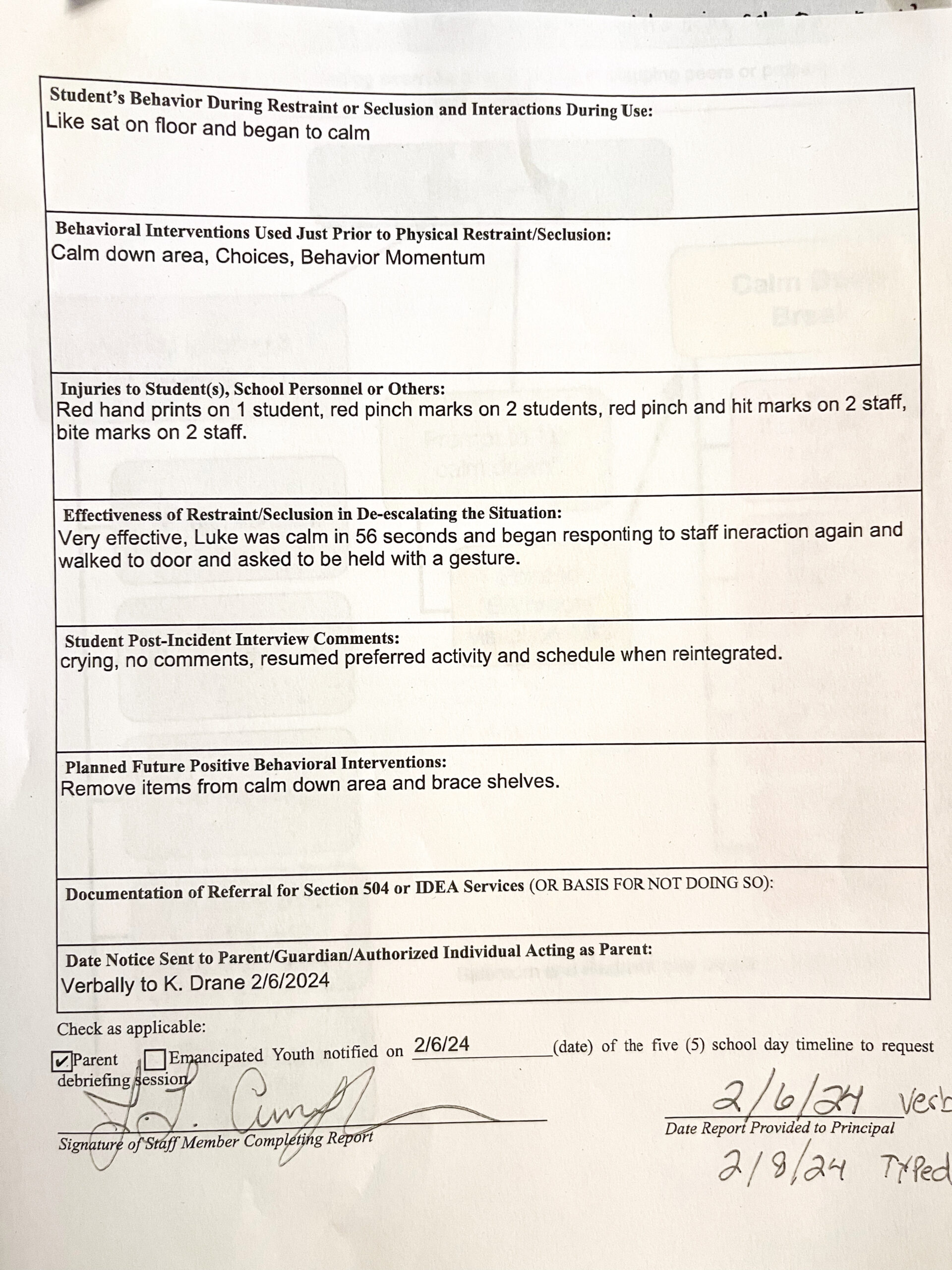 We received copies of Luke’s student records at the beginning of March 2024, nearly one month after we left. One of the first things we found was the seclusion report. We never did get a copy of the parent contact log I requested. (I talked more about Luke’s records in part 2).