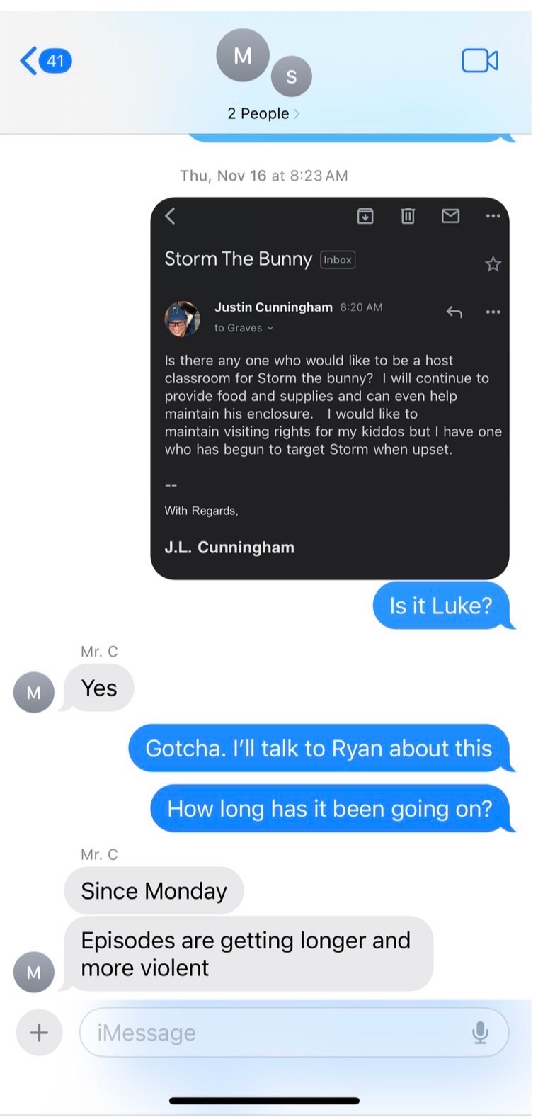 It was mid-November when everything came to a head. Luke’s class had a pet rabbit named Storm. For 2 months, the assistants had complained to Cunningham about Storm irritating their allergies and that the rabbit’s maintenance was too much, given the needs of the kids in the class. I was there for several of these conversations and not once did anyone mention that Luke was treating Storm badly. You can imagine my shock when I opened my Chromebook and saw a school-wide email looking to relocate the rabbit because “I have one who has begun to target Storm when upset.” I immediately texted Cunningham who confirmed that the student in the email was Luke. I felt blind-sided, confused, mortified, and gravely concerned. Not once had anyone even suggested to me that Luke had attacked the class pet. It was uncharacteristic of him anyway; Luke loved animals.