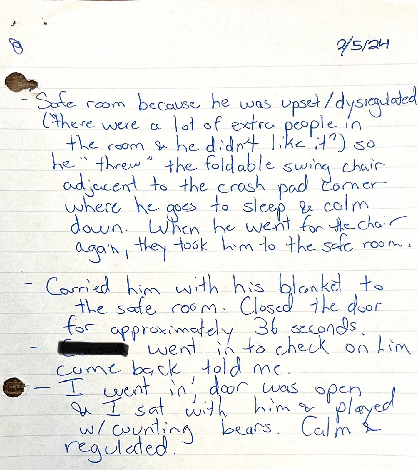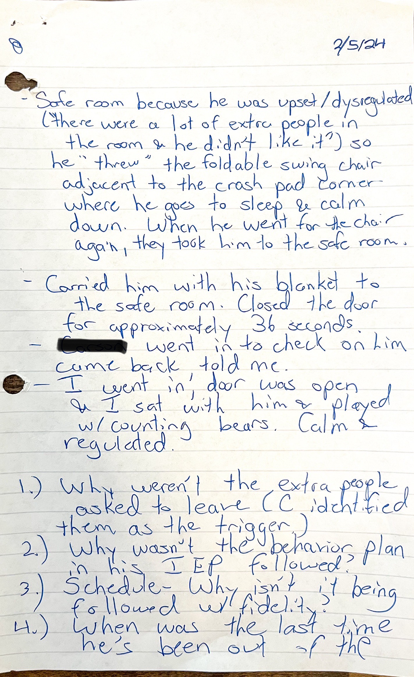 Cunningham told me that Luke was trying to fall asleep on the crash pad but couldn’t because there were extra people in the room who were being loud. Luke became dysregulated and angry and threw a folding camp swing chair. When he tried to throw it again, Cunningham decided to take Luke to the safe room. Cunningham said that Luke let him carry him without incident to the safe room. Cunningham ended the conversation by admitting that he ‘shouldn’t have had the extra people in the room”.