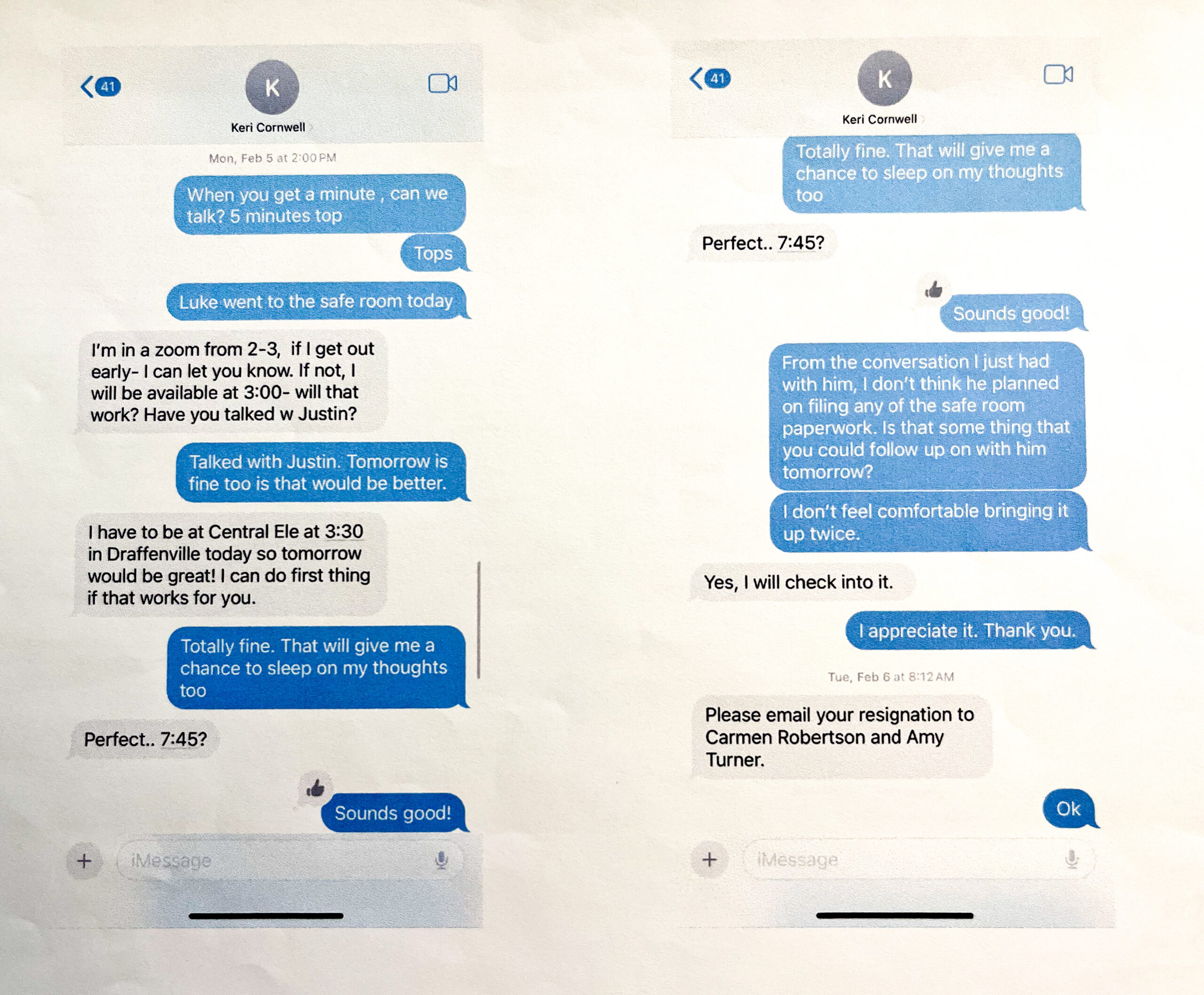 I returned to the resource room and told my team what Cunningham told me. They were as shocked as I was, only I was more livid than shocked. It was a blatant misuse of seclusion. I immediately emailed Director or Special Ed Carmen Robertson and told her that Luke was put in the safe room and that I wanted a copy of the seclusion report as soon as it was available. I got no response. I scribbled down everything Cunningham told me as fast as I could. I texted Principal Cornwell about the incident and requested a meeting. From our text conversation, you can see what happened next.