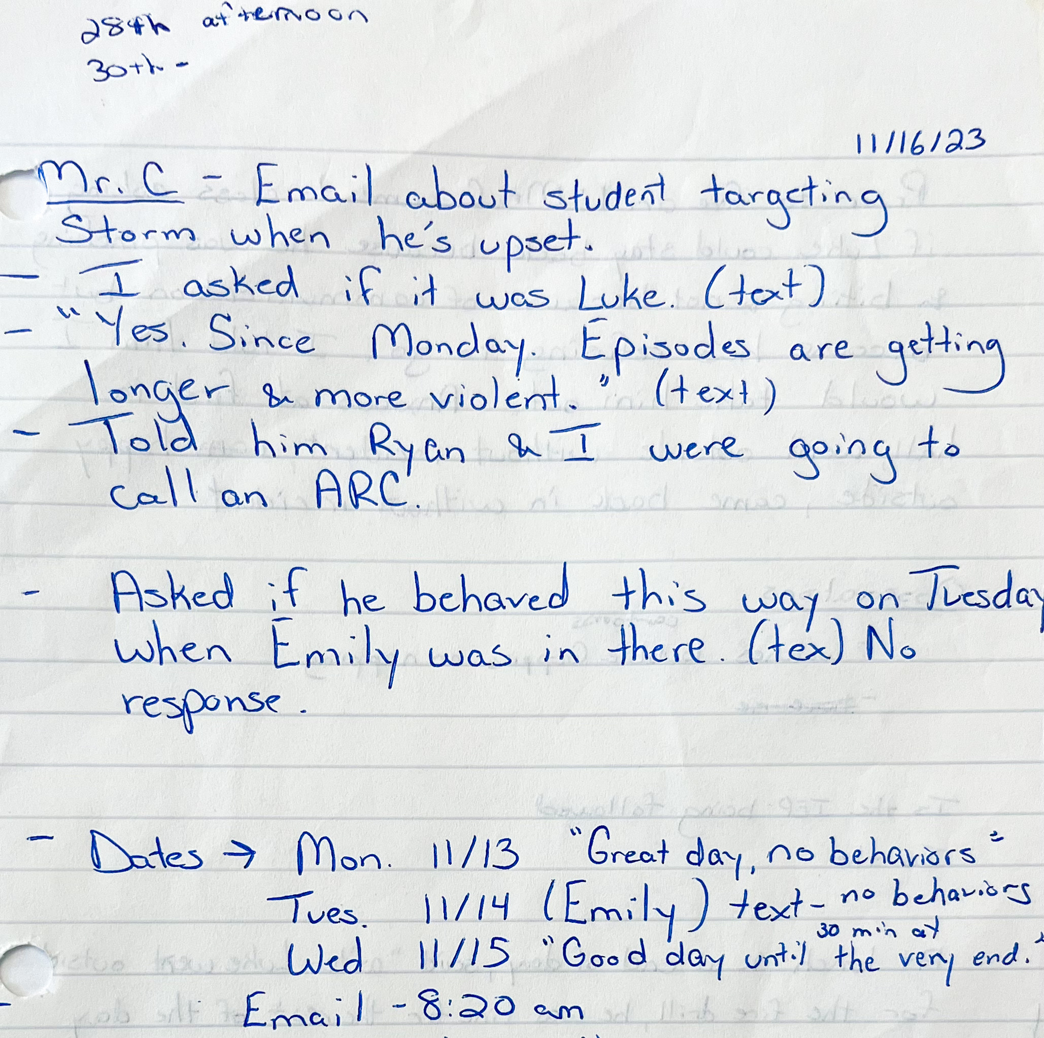 I kept a notebook at school that I used to document my interactions with my students, write down important dates, meeting notes, etc. Something as serious as harming an animal would have been in there. I flipped back through every single page, trying to see if there was a conversation I had forgotten. There was nothing. Trying to make sense of the email, I started writing down a timeline and everything I was told about Luke’s week. I was so upset about the email and that nothing I was told throughout the week matched what Cunningham had texted me, that I went to Principal Cornwell’s office and scheduled an ARC meeting (IEP meeting).
